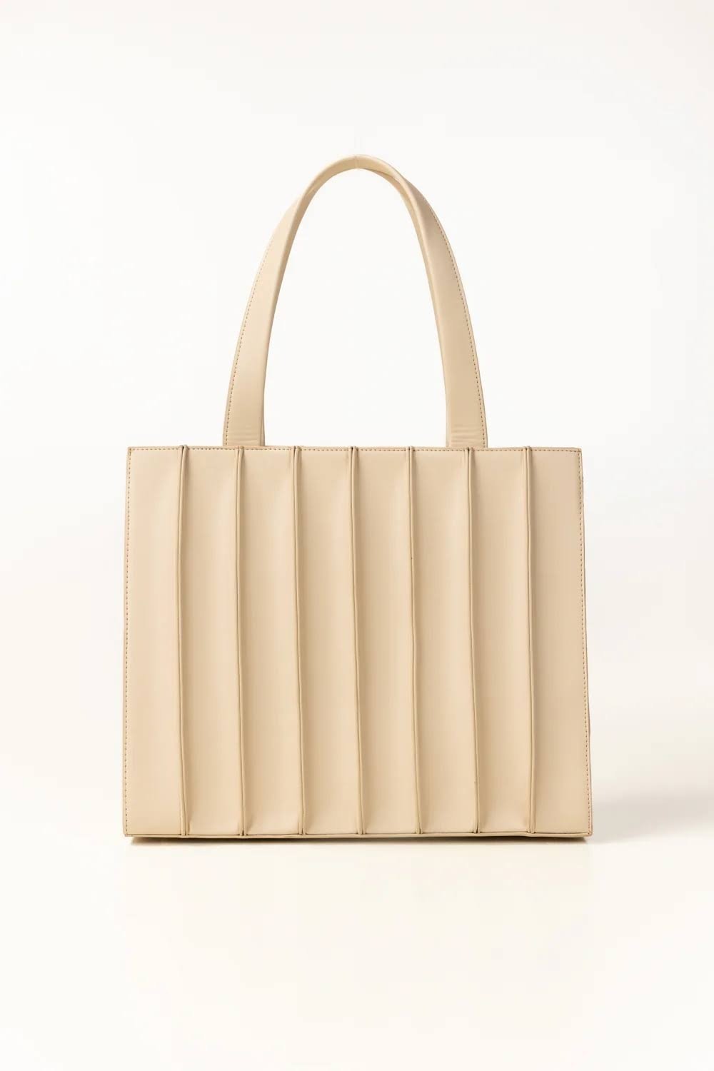 This elegant leather tote bag stands out with its distinctive pleated design that brings dimension and artistic flair to a classic silhouette. The beautiful beige color provides a neutral foundation that works with any outfit, while the vertical pleats add texture and visual interest that sets this bag apart from ordinary totes. The structured design maintains its shape beautifully, creating a polished look that feels both modern and timeless.
